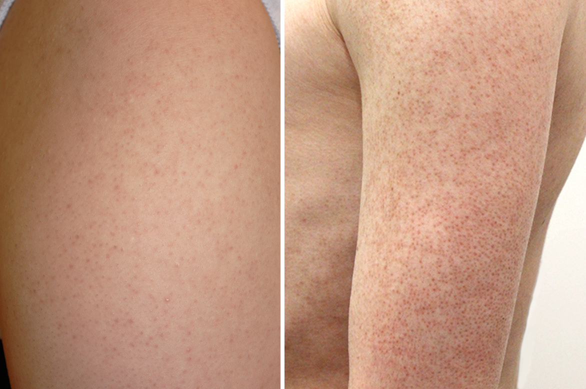 ⼆の腕以外の部位にも衣類との摩擦を受けやすい部位に出現しやすい傾向があります。皮膚に現れるブツブツのサイズは小さくおよそ1~3mmです。発症率に男⼥差はなく、接触などで移る⼼配もありません。また放置しても健康上に重大な問題を引き起こすことはありません。