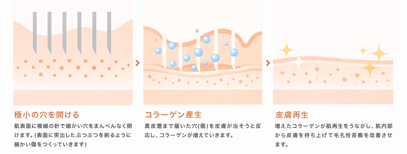 当院では二の腕・背中のブツブツ(毛孔性苔癬)の治療に、ダーマペン4という機械を使います。⽑⽳に固く詰まった⾓質を排出し、真皮のコラーゲン・エラスチンの増殖を助け、肌のなめらかさを取り戻す治療です。また⼀⼈ひとりの⽪膚症状に合わせた薬剤と併⽤し、効率的に⼆の腕・背中のブツブツに働きかけます。