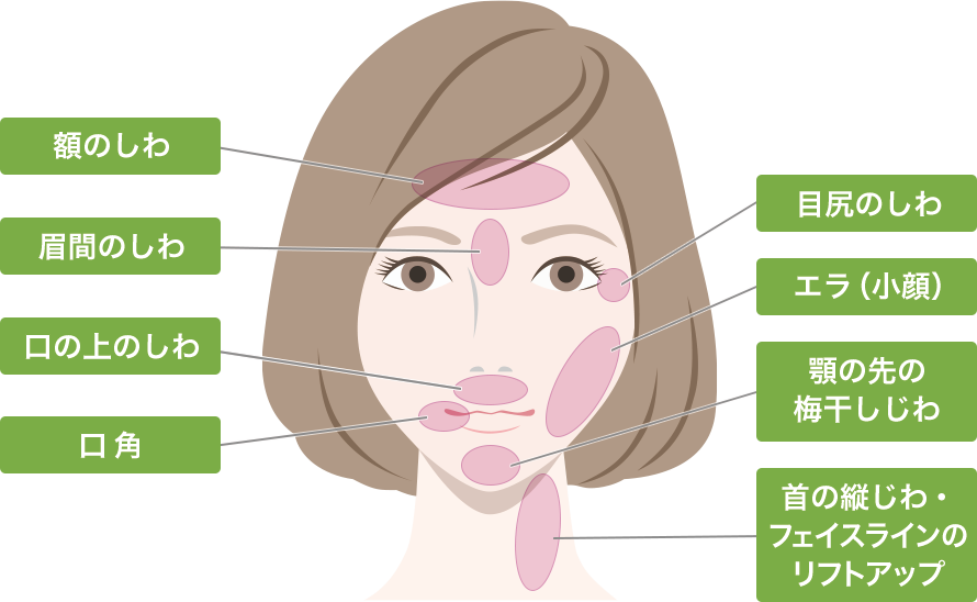 ボトックス注射は、筋肉を緩める作用があるボツリヌストキシン(ボトックス)を注射することで、筋肉の収縮を抑え、表情じわを改善する治療です。お顔の表情筋に注射すると、額や目尻、口まわりにしわがよるのを防ぐことができます。しわ以外にも局所的に筋力を抑えることで、お顔のえらにボトックスを注射しての小顔効果や、首への注射で縦じわの改善、フェイスラインのリフトアップの効果があります。また、発汗を抑制する作用もあるため、多汗症の症状も改善します。