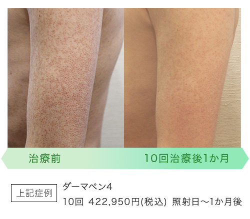 当院では二の腕・背中のブツブツ(毛孔性苔癬)の治療に、ダーマペン4という機械を使います。⽑⽳に固く詰まった⾓質を排出し、真皮のコラーゲン・エラスチンの増殖を助け、肌のなめらかさを取り戻す治療です。また⼀⼈ひとりの⽪膚症状に合わせた薬剤と併⽤し、効率的に⼆の腕・背中のブツブツに働きかけます。